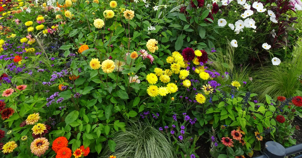 図書館のボーダー花壇には、色とりどりの花がふんだんに使われていましたが、決して雑然とした印象はなく、色数が多くても調和のとれた美しい植栽になっていました。高さのある植物の取り入れ方や、色の配置バランスなど、日々の庭づくりに取り入れたいヒントが詰まっていると感じました。この時期には、あちこちでダリアをよくみかけました。日本では、夏の時期の猛暑と湿度で弱りがちなダリアも元気そうに育っていました。